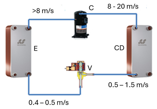 The mass flow rate of the refrigerant (M, kg/s) was calculated as the ratio of the compressor volumetric flow (V, m3/s) and the specific steam volume (v, m3/kg; suction nozzle, temperatures from the refrigerant p-h diagram). The diameter (inside) was calculated using V and velocity (c, m/s) (c in the individual parts of the cooling system are shown in Figure 2).