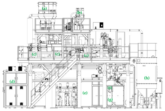 Figure 4. The stretch film production line (cast method); (a) extruder buffer tank (4 pieces), (b) extruder buffer tank (2 pieces), (c) extruders (6 pieces), (d) control and monitoring system, (e) film cooling system, (f) FCR, (g) connection of cooling system of the FCR, (h) regranulate tank.