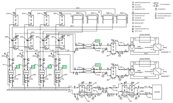 HP evaporators (PC1-PC4) or fan coolers (DR1-DR4) supplied the primary side of the heat exchanger, while the load is the hydraulic system receiving heat from the FCR. This rotating cylinder’s stable (and uniform) surface temperature is ensured by the water flow (around 150 m3/h; inlet 15 °C, outlet 16 °C). Buffer tanks Z1 and Z2 (parallel connected) (2 m3 each) were proposed, constituting a cold storage (and increasing the water load in the installation), which translates into the inertia of the installation and a water pump P1 with smooth efficiency regulation (three-way mixing valve (ZM1) and regulators). The basic cooling sources (at the same time the first stage of heat recovery) are compressors of HP (in PC1–PC4 modules), for which the lower heat source is the heat necessary to cover the calender’s cooling demand. Heat pump evaporators are hydraulically coupled with Z1 and Z2 via Z3 and Z4 tanks (2 m3 each) and a heat exchanger (plate). This exchanger ensures, in the hydraulic system, the separation of glycol (primary side of the exchanger; heat or cooling carrier) and water (secondary side of the exchanger; technological cooling carrier). The role of Z3 and Z4 is to increase the glycol charge (system’s inertia) and, as a result, stabilize the temperature of the lower source of heat. The glycol flow between tanks Z3 and Z4 and the plate heat exchanger (primary side) is managed by pump P3 (with adaptable capacity control) to ensure a constant temperature difference of 3 K. This adaptability is also evident in the flow between tanks Z3 and Z4 and the HP evaporator, where the P4 pump, also with adaptable capacity control, is adjusted to the current evaporator heat load. The heat load of the PC1 condenser (and in the subsequent PC2–PC4 modules), depending on the mode of operation, can be buffered by Z5 and Z9 (2 m3 each) or the DR4 fan cooler.