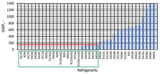 The GWP coefficient value of the selected refrigerants ranges from 1 to 1397, which is why all refrigerants in the case of the implementation of a technological heat recovery device in the form of a two-stage device can be used in the lower stage of the device. However, in the upper stage of the device and the case of single-stage structures, only refrigerants with a GWP coefficient value of <150 can be used, which means that the number of possible refrigerants is 22 (from RE170 to R455A in Figure 6).