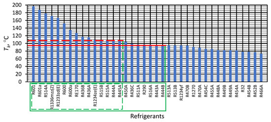 When selecting the design of the refrigeration system, the temperature of the lower and upper source is an important parameter. For the designed process heat recovery line, the lower source temperature is the temperature of the medium cooling the FCR (15 °C). In contrast, the upper source temperature is the required temperature of the medium drying the recycled regranulate (designed 95 °C). Because the designed refrigeration system must be subcritical, the upper source temperature must be lower than the Tk of the refrigerant but should be higher than the required technological temperature (95 °C). Figure 7 presents a list of the selected refrigerants as a function of Tk (22 refrigerants meet the Tk > 95 °C criterion, from R601 to R444B). The Tk temperature of sixteen of the selected refrigerants (from R466A to R513A) is lower than the required technological temperature of 95 °C. In the lower stage of the refrigerant system, they can be used. However, to ensure the refrigeration device’s safe operation, the required Tk value has been increased to 105 °C, which extends the possibility of refrigerants in the lower stage (to 23, from R450A to R513A, Figure 7).