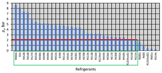 The following criterion is the refrigerant pressure (as a function of Ts), which should be higher than atmospheric pressure. The lowest value of Ts (from the point of view of the operation of the refrigeration device, from the recovery of technological heat, should be lower by 10–15 K) was assumed to be 0 °C. In contrast, the lowest limit value of ps was considered to be 2 Bar. Therefore, the refrigerants R600a, R600, R1233zd(E), R601a, R514A, and R1336mzz(Z) (Ts = 4.04 °C, ps = 0.3 Bar), R601 (Ts = 4.58 °C, ps = 0.3 Bar) could not be used in the first stage of the refrigeration device (Figure 8).