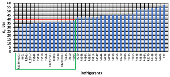 The last criterion considered was the value of the critical point pressure (pk). For safety reasons and technological problems related to the implementation of the cooling system, it was assumed that pk should not be higher than 40 Bar. For this reason, the refrigerants from R290 to R32 (despite meeting the previously discussed criteria) should not be used in the second stage of the technological heat recovery device (Figure 9).