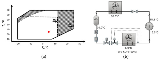 Figure 10. Operating envelope of the 8FE-60Y compressor; suction gas superheat ≤20 K, suction gas superheat >10 K, M1 motor 1, M2 motor 2, A (a) and parameters of a low-temperature HP (b).