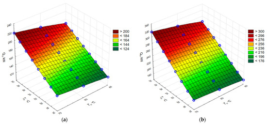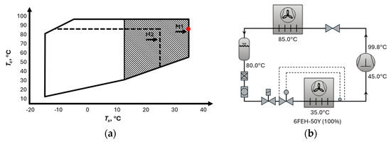 The high-temperature compressor HP uses parallel-connected (semi-hermetic, piston) 6FEH-50Y compressors. The Ts range of the R1234yf refrigerant is from −15 °C to 35 °C, while Tc is from −10 °C to 95 °C (Figure 11a). Considering the technical parameters of the low-temperature heat pump (temperature of the upper heat source 25–50 °C, the evaporator is a plate heat exchanger, the difference between the Ts of the refrigerant and the temperature of the lower heat source: 10 K), the possible range of Ts of the refrigerant was established: 16 °C ÷ 30 °C. For a high-temperature subcritical HP powered by a 1234ze(E) refrigerant, taking into account Ts = 35 °C and the compressor operating envelope, the refrigerant condensation temperature was assumed to be 85 °C (the upper heat source range was considered to be 75–85 °C—technological process requirements). The refrigerant superheating was believed to be 10 K, and subcooling was 5 K (Figure 11b).