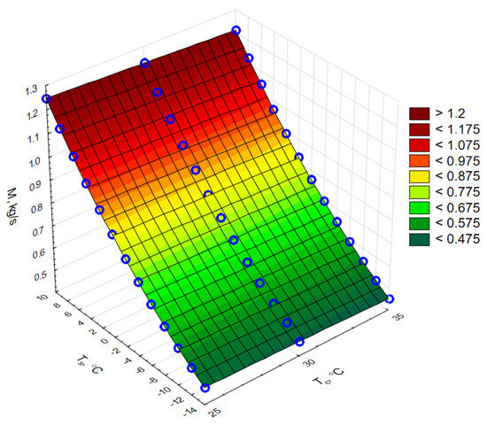 Figure 13. Mass flow of the refrigerant in a low-temperature HP for the assumed design Ts and Tc of the R1234yf refrigerant.