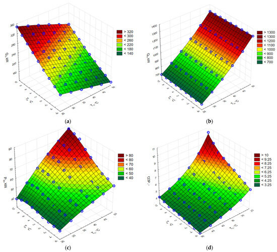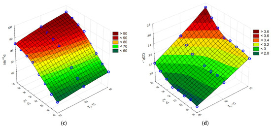 The cooling capacity (Figure 14a), heating power (Figure 14b) and COP (Figure 14d) increase with increasing Ts and decreasing Tc, while the power of the two compressors (Figure 14c) increases with increasing both Ts and Tc. The available power of cooling corresponds to the technological cooling of the FCR of the technological line for foil production. Therefore, the nominal operating point of the HP is: Ts = 4 °C and Tc = 35 °C.