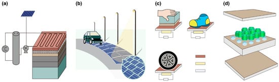 The global demand for sustainable energy solutions has surged with growing urban populations and the environmental and economic challenges of fossil fuel dependency. Renewable energy sources, such as solar, wind, and geothermal, are vital to meeting these needs, yet their integration into dense urban environments is complex. Pavements, covering 30–40% of urban surface areas, offer a largely untapped resource for renewable energy harvesting due to their exposure to solar radiation [1,2], vehicle-induced mechanical stresses [3,4], and thermal gradients [5]. These surfaces absorb approximately 95% of incident solar energy, reaching temperatures of 60–70 °C in summer [2], while their dark-colored surfaces generate significant thermal energy, and traffic induces mechanical vibrations. These diverse energy forms—solar, thermal, and mechanical—can be captured using technologies like asphalt solar collectors (Figure 1a), photovoltaic pavements (Figure 1b), piezoelectric transducers (Figure 1c), and thermoelectric generators (Figure 1d), enabling on-site power for urban infrastructure, such as streetlights, traffic sensors, or electric vehicle charging, or supplementing broader energy grids to reduce reliance on non-renewable sources [6,7]. Despite their potential, challenges, such as high installation costs, environmental stressors like rainwater intrusion, and variable performance across climates, highlight the need for systematic comparisons of these technologies to optimize their efficiency and feasibility [8,9].