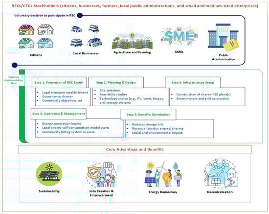 The EU, through the “clean energy package (CEP),” officially recognizes RECs and clearly defines concepts such as self-consumption, collective consumption, electricity sale, and energy sharing. The CEP also analyzes the implications for consumer rights and protections. It examines the role that RECs can have in the flexibility of the market and network operators. It outlines the ownership, operation, and management of electricity networks. RECs and citizen energy communities (CECs) are important means of involving citizens in energy issues []. In [], the authors report the actions that EU Member States have implemented to support the development of RECs. At the EU level, the actions include issuing directives that establish a legal framework to support and promote RECs, which individual Member States then implement.