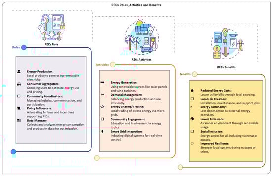 In [], it is discussed how RES and REC projects also present psychological and social problems. The article presents a combination of the economic perspectives of RECs with ecological policy research on alternative economies. This leads to the concept of CREEs (community renewable energy ecologies) that could influence political decisions. Fundamental elements that must be considered are property, finance, labor, and infrastructure. Benefits, problems, and dangers of RECs are also reported, together with contributions connecting political ecologies with different economic perspectives. Specific ethical–political orientations in RECs are identified. Extending the development of RECs to these areas expands the possibilities of social experimentation beyond capitalism. In [], they conducted a thorough examination of how a REC can facilitate the green transition.
