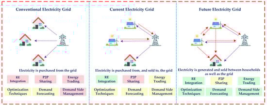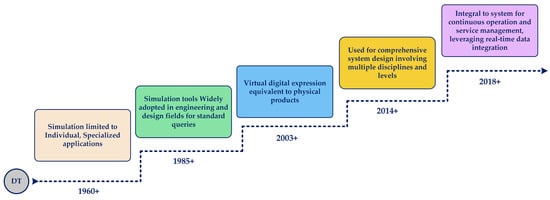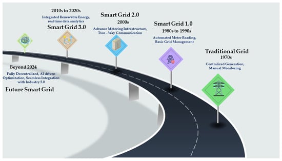 The energy sector is undergoing a significant transformation, driven by the dual objectives of decentralization and decarbonization, aimed at developing a cleaner, more flexible, and sustainable energy system. Digitalization is playing an increasingly important role in reshaping the energy sector, driven by the growing integration of digital technologies with traditional energy infrastructures. As the sector moves toward decentralization and decarbonization, the adoption of technologies such as the Internet of Things (IoT), Artificial Intelligence (AI), and data analytics is becoming vital for supporting these changes [10,11,12]. These digital tools enable real-time monitoring, predictive analysis, and more efficient management of energy systems, which enhance overall performance and operational flexibility. The convergence of digital and physical systems is particularly beneficial for optimizing the integration of renewable energy sources and Distributed Energy Resources (DERs), while also improving grid reliability and system resilience. This fusion is integral to the development of smart grids and Digital Twin models, both of which are essential to creating a more sustainable, flexible, and user-responsive energy infrastructure. Recent advancements in digital technologies, coupled with sophisticated control systems, are set to significantly transform the energy landscape. These innovations are driving the accelerated adoption of renewable and low-carbon energy sources, such as solar, wind, and energy storage solutions, while simultaneously enhancing system efficiency and flexibility [13]. Furthermore, the integration of advanced control systems helps optimize the balance between supply and demand, improves grid stability, and reduces energy losses. Together, these technological developments not only support the transition to a cleaner energy mix but also foster greater resilience and adaptability in energy systems, contributing to more sustainable and efficient operations across the sector [14]. Figure 3 illustrates the evolution of smart grid systems from the 1970s to the present and into the future. It highlights the transition from traditional centralized energy models to advanced, decentralized networks, driven by the integration of renewable energy sources, digital technologies, automation, and active consumer participation—enabling a more efficient, resilient, and sustainable energy ecosystem.