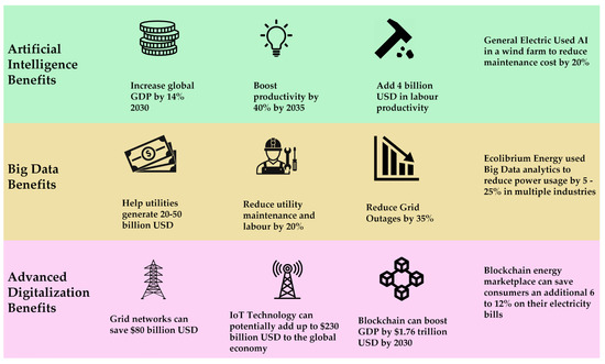 The integration of advanced digital technologies forms a comprehensive framework to address the challenges of Advanced Energy Systems. This synergy improves grid management, optimizes resource allocation, and enhances overall system resilience. Artificial Intelligence (AI) plays a key role in predicting fluctuations in energy demand through the analysis of historical consumption data, weather forecasts, and real-time grid inputs. This allows for timely adjustments in energy generation and distribution, particularly crucial for managing intermittent renewable energy sources such as solar and wind. The Internet of Things (IoT) further supports this process, with devices like smart meters and sensors providing continuous data streams from DERs. These devices enable real-time monitoring, which helps optimize resource usage and facilitates demand-side management, allowing consumers to adjust their energy consumption based on grid conditions or pricing signals. Blockchain technology enhances the security and transparency of energy transactions by enabling decentralized peer-to-peer (P2P) energy trading. This allows prosumers to directly exchange excess energy, such as surplus solar power, without the need for traditional utility intermediaries. Digital Twin (DT) technology complements this ecosystem by creating virtual models of physical energy systems, allowing operators to simulate grid behavior, anticipate failures, and optimize maintenance schedules without affecting the actual infrastructure. For example, DTs can model the integration of renewable energy sources or evaluate the impact of new storage solutions, thus improving decision-making processes. Several real-world applications demonstrate the impact of these technologies. Google’s DeepMind has optimized the cooling processes at power plants, leading to significant energy savings. Siemens uses predictive maintenance in wind turbines to reduce downtime, while IBM’s platform assists in forecasting renewable energy output. Additionally, AutoGrid’s automated energy trading system helps utilities optimize market operations, and WattTime enables consumers to choose cleaner energy, reducing carbon emissions [21]. Together, these technologies contribute to a more efficient, sustainable, and resilient energy system, supporting the transition to a decarbonized future while enhancing the reliability and flexibility of energy infrastructure [22,23].