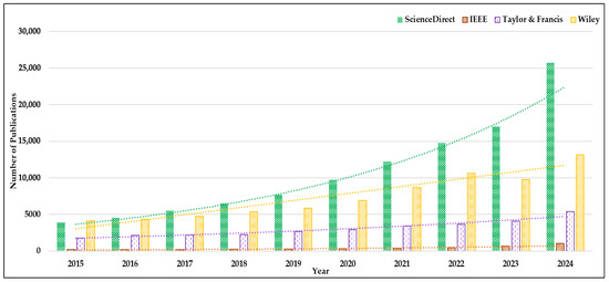 Figure 6 illustrates the comparative volume of peer-reviewed publications related to digital technologies applied in advanced energy systems, retrieved from four prominent academic databases: IEEE Xplore, ScienceDirect, Taylor & Francis, and Wiley. The dataset was compiled following a rigorous and systematic search protocol, employing the Preferred Reporting Items for Systematic Reviews and Meta-Analyses (PRISMA) framework to ensure methodological transparency, reproducibility, and comprehensiveness. The data were collected through a structured and systematic search protocol, using a combination of relevant keywords and Boolean operators, including but not limited to: “digital technologies”, “smart grids”, “advanced energy systems”, “Internet of Things (IoT)”, “artificial intelligence (AI)”, “blockchain”, and “digital twins”. The search was limited to journal articles and conference proceedings published between 2014 to 2024, with further filters applied to ensure alignment with the scope of energy systems and digital innovation. Among the databases, IEEE Xplore contained the largest number of relevant publications, reflecting its strong focus on engineering, automation, and information and communication technologies (ICTs). ScienceDirect followed closely, contributing significantly from multidisciplinary domains such as energy systems engineering, data science, and environmental technology. Taylor & Francis and Wiley demonstrated a moderate yet valuable contribution, particularly in journals focused on energy policy, digital transformation, and applied engineering. Notably, MDPI, although a rapidly growing open-access publisher with increasing visibility in the energy and digital domains, presented a smaller collection—approximately 200 publications—matching the defined inclusion criteria. This relatively modest representation may reflect the publisher’s more recent focus on this research domain or the influence of the specific search parameters and filters applied during the systematic review process. The publication distribution across databases underscores the expanding academic interest in digitalization within energy systems and reflects the global research community’s response to technological challenges and opportunities associated with Sustainable Development Goal 7 (SDG 7)—which emphasizes universal access to affordable, reliable, sustainable, and modern energy. This analysis also aids in identifying key knowledge repositories and may inform future literature review strategies and database selection for researchers in the field.