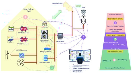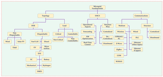 Microgrids necessitate advanced energy management systems to enhance the operation and real-time control of distributed energy resources, thereby ensuring stability and performance. In the last ten years, many optimization strategies have been investigated, encompassing mathematical techniques, metaheuristic methods, and sophisticated learning algorithms, with a strong emphasis on minimizing operational expenses and improving real-time control. A variety of studies have explored microgrid energy management systems from multiple viewpoints. For example, [34] examines energy management and control systems (EMCS) in building applications, focusing on the integration of thermal energy supply and electrical power generation, while noting that optimization methods are mainly rooted in mathematical and metaheuristic approaches. A critical analysis of microgrid control methods is presented in [35], while EMS for DC microgrids is comprehensively reviewed in [36,37]. In particular, ref. [37] offers a more extensive overview of optimization techniques, while Al-Ismail [36] conducts a critical examination of EMCS methods. Investigations such as [38,39,40,41,42] explore deeper into EMCS for microgrids, covering a range of classifications and subjects. In the design of a microgrid, it is essential to meticulously evaluate various operational aspects to guarantee its effectiveness and performance, as shown in Figure 7. These aspects encompass elements such as energy management, load prioritization, fault handling, and grid interaction strategies, each of which plays a crucial role in enhancing the overall performance and adaptability of the microgrid system. Figure 7 provides an overview of the fundamental components and operation of a microgrid. Also, it illustrates the integration of distributed energy resources, energy storage systems, control units, and loads within a localized network capable of operating both in grid-connected and islanded modes.
