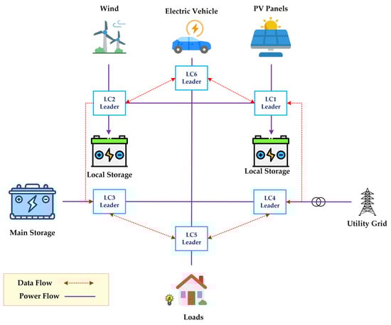 A distributed control or hierarchical control scheme is introduced as a compromise to address the limitations of both centralized and decentralized approaches. Distributed control combines elements of centralized and decentralized systems, enabling a degree of centralization while preserving local autonomy. This method involves each unit functioning according to its local controller, making use of the information available in its immediate environment, including frequency and voltage. However, in contrast to completely decentralized control, units share information with adjacent controllers through two-way communication links. This collaborative communication facilitates coordinated decision-making throughout the system while maintaining the confidentiality of individual units, as sensitive information is not disseminated universally. Distributed control improves system stability, scalability, and fault tolerance, rendering it especially appropriate for contemporary microgrids where flexibility and efficiency are essential [41]. Figure 11 illustrates a hierarchical control structure that combines centralized and decentralized control approaches. It features multiple control layers—typically primary, secondary, and tertiary levels—each responsible for specific functions such as local regulation, coordination among subsystems, and overall system optimization, enabling efficient and reliable management of complex energy networks.