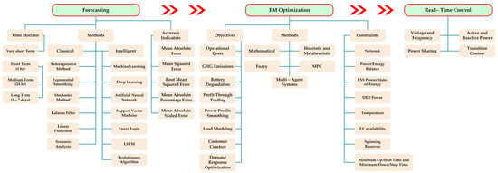The implementation of an EM control strategy necessitates the categorization of the MG system into various operational levels, with each level coordinating with the others. The levels encompass power generation sources that employ techniques such as Maximum Power Point Tracking (MPPT) to end-users including both local consumers and those farther away, such as neighbouring microgrid consumers. In contemporary systems, intelligent components are incorporated into every source and microgrid system. Advancements in Information and Communication Technologies (ICTs) enable these components to communicate and cooperate with remarkable efficiency. Modern inverters, for instance, are capable of employing a range of control strategies, including the regulation of source power, the facilitation of grid interconnectivity, and the coordination with other microgrids. Moreover, these inverters are capable of supporting extensive microgrid systems, allowing for data clustering and promoting electricity exchange. Through internet connectivity, inverters have the capability to archive historical data in cloud servers, thereby enhancing long-term monitoring and system analysis. Nonetheless, a notable challenge persists: the main goal for numerous inverters is to provide a continuous power supply to users, frequently overlooking considerations like the longevity of battery storage systems or the expense of electricity. To tackle this gap, it is essential to create an EM control strategy that: analyses fluctuations in electricity pricing, reduces the frequency of battery charge and discharge cycles to extend battery lifespan, and enhances overall profitability of the system by decreasing electricity expenses. The primary objective is to develop a sophisticated and anticipatory control strategy that can enhance the functionality of DERs in the microgrid environment. This strategy needs to tackle various constraints and objective functions at the same time to guarantee efficient energy use, lower operational costs, and longer component lifespans, ultimately improving the overall stability, profitability, and sustainability of the MG system. Figure 14 illustrates the three key stages of energy management and control strategies: forecasting, energy management optimization, and real-time control. The forecasting stage involves predicting energy demand and generation based on historical data and external factors. The optimization stage focuses on developing optimal schedules and resource allocations to balance supply and demand efficiently. Finally, the real-time control stage executes control actions to adjust system operations dynamically, ensuring stability, reliability, and efficient performance of the energy system.