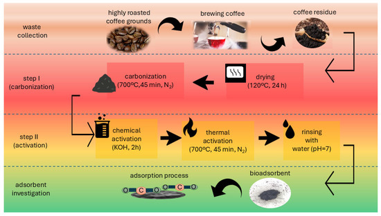 The bioadsorbent (AHRoCG—Activated Highly Roasted Coffee Grounds) was produced in a two-step process. In step I (carbonization), highly roasted coffee ground post-brewing residue (HRoCG—Highly Roasted Coffee Grounds) was pre-dried at room temperature and then dried at 120 °C for 24 h to remove moisture. Next, the material was carbonized at 700 °C for 45 min in a nitrogen atmosphere (the high temperature contributed to the decomposition of organic matter and the nitrogen prevented oxidation). The final product was porous carbon structures characteristic of biocarbon (CHRoCG—Carbonized Highly Roasted Coffee Grounds). In stage II (modification), the chemical activation of the CHRoCG was carried out using KOH. For this purpose, solid KOH was mixed with the CHRoCG in a mass ratio of 2:1 and moisturized for 2 h. Next, the mixture was dried at 105 °C in an air dryer for 24 h. After this, it was heated in a muffle furnace at a rate of 5 °C min−1 up to 700 °C in a nitrogen atmosphere. After 45 min of thermal activation at 700 °C, the mixture was cooled and washed with distilled water until pH = 7 to remove residual KOH. Finally the sample was dried at 105 °C in an air dryer for 12 h and denoted as AHRoCG.