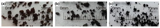 Most HRoCG particles (Figure 2a) are in the range of 0.75–1.25 mm (the largest do not exceed 1.75 mm), CHRoCG (Figure 2b) are 0.5–1.0 mm (the maximum 1.75 mm), and, after activation, the bioadsorbent particles are (Figure 2c) 0.25–0.5 mm (the maximum ca. 1.25 mm). This confirms that the bioadsorbent production process reduces the size of the material at each step; however, from the point of view of application in fix beds, pelletization is required.