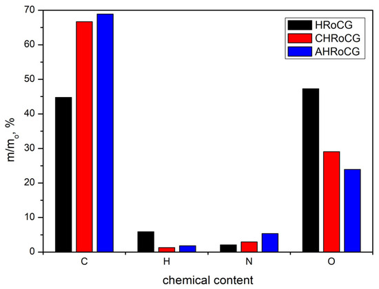 The chemical composition of the HRoCG, as well as that of the obtained CHRoCG and AHRoCG, in the two-stage treatment process is shown in Figure 4. The initial biowaste had a carbon content of 44.8% w/w, which increased up to 66.7% w/w in the biochar and 68.9% w/w in the final bioadsorbent. This confirms the high-carbon content of the obtained material as a result of the carbonization of the HRoCG and following the activation of the CRoCG by KOH. The AHRoCG is characterized by higher nitrogen and lower hydrogen and oxygen contents compared to the HRoCG and CHRoCG. During the investigation, no sulfur was found in all three samples and, as such, these values are not included in the figure.