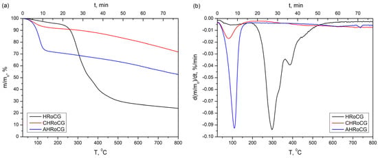 Profiles of (a) TG and (b) DTG of the initial biowaste (HRoCG) and biochar (CHRoCG), as well as the bioadsorbent (AHRoCG) obtained as a result of its modification.
