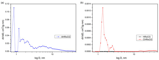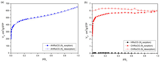 Figure 7 presents the N2 adsorption–desorption isotherms for the AHRoCG (Figure 7a), as well as for the HRoCG and CHRoCG obtained through its modification (Figure 7b).