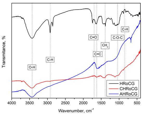 FTIR of bioadsorbent (AHRoCG), biocarbon (CHRoCG) and biowaste (HRoCG).