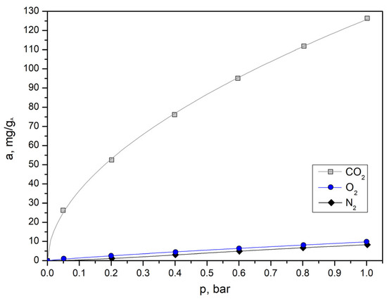 The CO2 isotherm is characterized by nonlinearity and a sharp increase in carbon dioxide adsorption at low pressures. With increasing pressure, the capacity gradually decreases; however, it is still much greater than in O2 and N2 isotherms, which feature characteristic linearity and low adsorption of these gases.