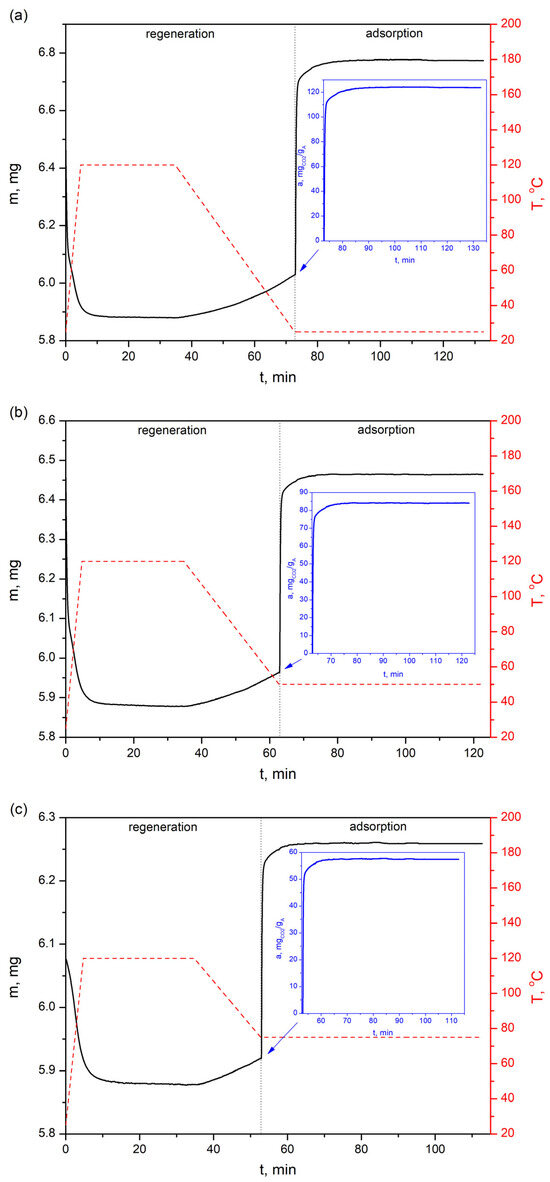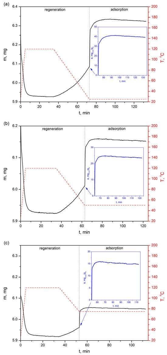 Figure 11, Figure 12, Figure 13 and Figure 14 present the carbon dioxide adsorption profiles of bioadsorbent at different feed gas CO2 concentrations (simulating the exhaust gases from various types of industries (16 vol.% CO2, 30 vol.% CO2, 81.5 vol.% CO2 and, for reference, 100 vol.% CO2), and at three different adsorption temperatures (25 °C, 50 °C and 75 °C). The initial sample weight of about 6.2 mg was subjected to temperature regeneration (comprising three steps: heating, baking and cooling). Next, the carbon dioxide adsorption process was carried out within 60 min at atmospheric pressure. The mass change during the whole process is indicated with a solid black line and the temperature change with a dashed red line. To better illustrate the adsorption capacity of the applied adsorbent (mgCO2 gA−1) in terms of unit mass, the main graph was supplemented with a nested graph (blue one).