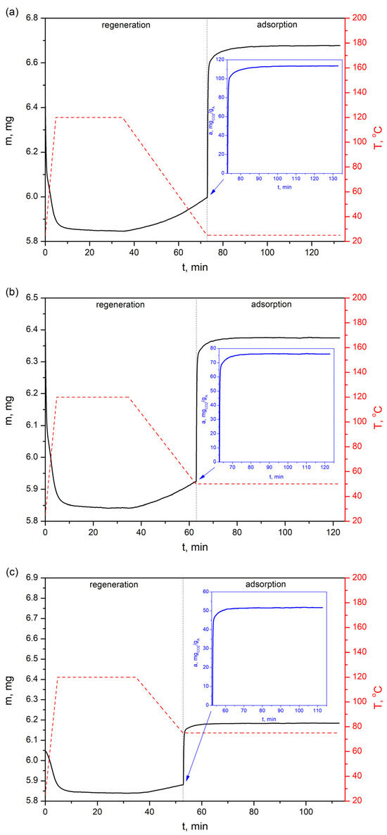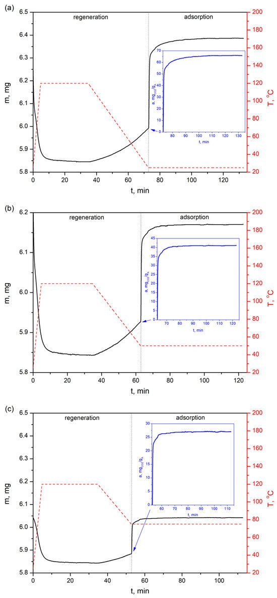 The CO2 adsorption profiles presented in Figure 12 show that the adsorption capacity on the AHRoCG at 30 vol.% CO2 is 65.8 mgCO2 gA−1 at 25 °C (Figure 12a), 41.2 mgCO2 gA−1 at 50 °C (Figure 12b) and 27.0 mgCO2 gA−1 at 75 °C (Figure 12c), decreasing with increasing temperature. A similar situation occurs for the highest analyzed CO2 concentrations in processing gases, i.e., for 81.5% vol. CO2 the adsorption capacity is 113.7 mgCO2 gA−1 at 25 °C (Figure 13a), 76.1 mgCO2 gA−1 at 50 °C (Figure 13b) and 51.7 mgCO2 gA−1 at 75 °C (Figure 13c), while for 100% vol. CO2: 123.6 mgCO2 gA−1 at 25 °C (Figure 14a), 84.0 mgCO2 gA−1 at 50 °C (Figure 14b) and 57.4 mgCO2 gA−1 at 75 °C (Figure 14c).