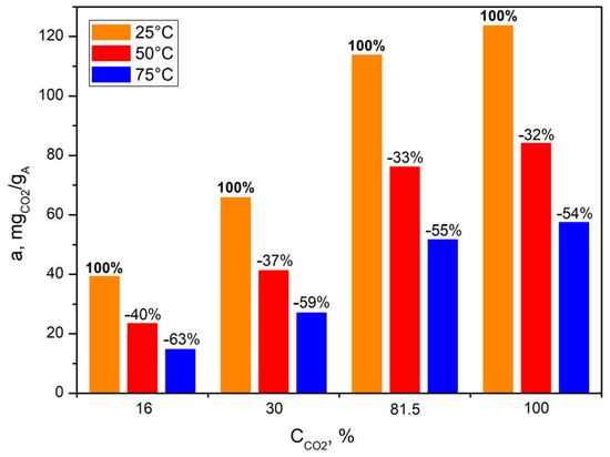 Increases in temperature (from 25 °C to 50 °C and then to 75 °C) caused decreases in adsorption capacity of −40% and −63% w/w, respectively, in the case of 16% vol. CO2 in the exhaust gas. The higher the concentration of CO2 in the feed gas subjected to separation, the smaller the observed decrease in adsorption capacity: −37% and −59% in the case of 30% vol. CO2, −33% and −55% in the case of 81.5% vol. CO2 and −32% and −54% in the case of 100% vol. CO2.