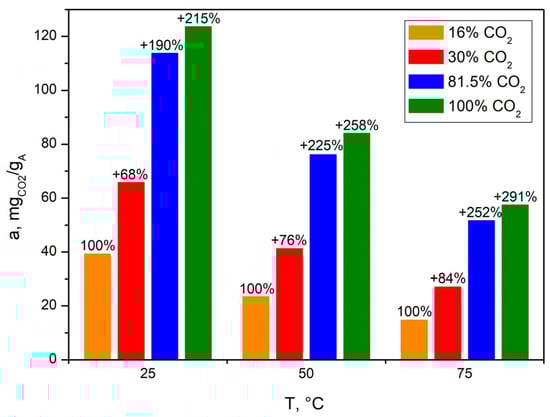 Increasing the CO2 concentration from 16 to 30% vol. CO2, then to 81.5% vol. CO2, and finally to 100% vol. CO2 increased the bioadsorbent adsorption capacity by 68% w/w, 190% w/w and 215% w/w at 25 °C. However, the higher the temperature in the adsorption step, the more and more noticeable the mass increase becomes (76%, 225%, 258% w/w at 50 °C and 84%, 252%, 291% w/w at 75 °C); however, the capacities achieved in relation to 25 °C were lower.