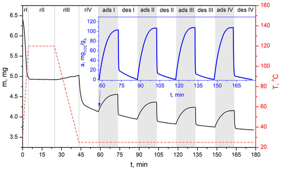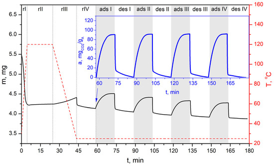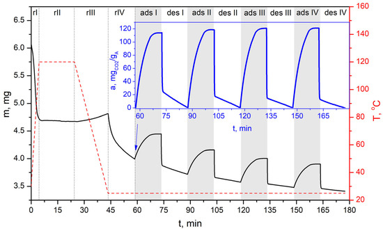 CO2 capture was simulated using the VSA technique and a TG-Vacuum system. After the adsorbent regeneration process (comprising four steps: (Ir) heating, (IIr) baking, (IIIr) cooling, (IVr) vacuum degassing), a sample with an initial weight of about 6 mg was subjected to four cyclic steps of carbon dioxide adsorption and desorption (ads I–IV/des I–IV). The results are presented in Figure 17, Figure 18 and Figure 19. In addition to the main graph presenting the mass changes in the sample during the whole experiment (solid black line), as well as the temperature changes (dashed red line), the nested graph (blue one) was also included, which shows the CO2 adsorption capacity of the adsorbent for four adsorption–desorption cycles, normalized to the initial value. The adsorption steps (ads I–IV) were carried out by slowly compressing the thermogravimeter measurement cell using pure CO2 from the set negative pressure (in the regeneration step) to ambient pressure (in the adsorption step). The ambient pressure was usually reached 4 min before the end of the adsorption step. The results were illustrated in the form of growing mass curves, reaching equilibrium before the end of the step. In turn, the desorption steps (des I–IV) were conducted by quickly depressurizing the thermogravimeter measurement cell to the set negative pressure, usually within about 3 min, and maintaining this at constant level until the end of the step with no purge gas flow. This process shows a rapid decrease in mass until the set vacuum pressure is reached, after which the mass decrease slows down significantly; this is related to the rate at which the component diffuses out of the adsorbent. In adsorbent use for industrial installations, it is not necessary to conduct full regeneration (which may take longer). In this way, these tests allow us to estimate adsorbent stability and provide information about its suitability for continuous operation in industrial installations.