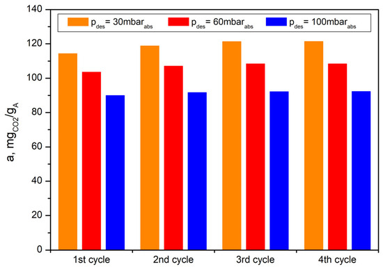 Working CO2 adsorption capacities of bioadsorbent (AHRoCG) in four subsequent cycles of the simulated VSA process using TG-Vacuum system.