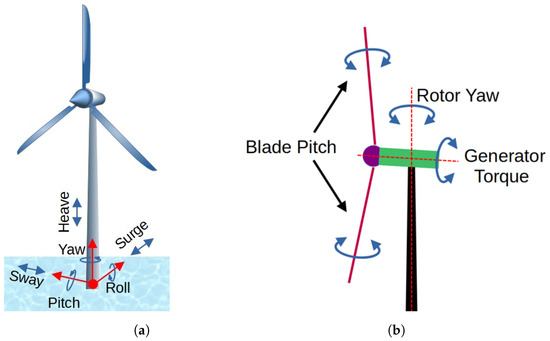 FOWT System. (a) FOWT motion degrees-of-freedom; (b) Typical FOWT actuators.