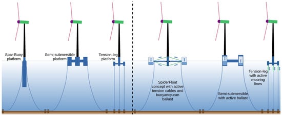 Popular (left) and novel (right) floating platform designs. The novel concepts shown are the SpiderFLOAT [28], active-ballasted semi-submersible [16], and actively moored tension-leg platform [34].