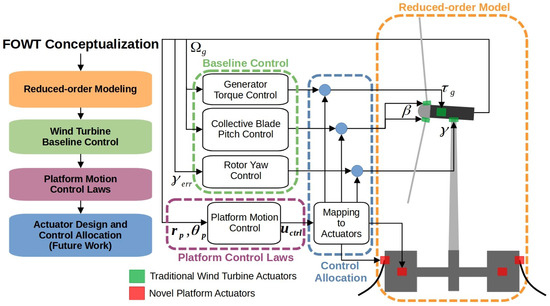 The proposed platform control development framework is described in Figure 3 as a four-stage process that begins with conceptualizing a novel FOWT system. Advanced FOWT concepts often begin with novel platform geometries, mooring systems, and actuator layouts. Yet, faithfully modeling blade and tower flexibility, drivetrain torsion, unsteady aerodynamics, wave kinematics, hydrodynamic damping, and nonlinear mooring forces can result in very high-order models that are untenable for control synthesis or rapid design exploration. To address this, the framework uses a reduced-order model that assumes rigid, multi-body dynamics, with six DOF platform motion and the rotor spin. This preserves the critical rotor–platform coupling, enables formal Lyapunov-based controller design, and facilitates early-stage analysis without resorting to costly high-fidelity simulations. The conventional wind turbine control comprising of the generator torque control and collective blade pitch control can be derived through established methods such as the Reference Open-Source COntroller (ROSCO) framework [40]. Optionally, a rotor yaw control may be set up if needed by the application. Next, unconstrained, actuator-agnostic control laws to control six DOF platform motion are derived using Lyapunov’s direct method and the reduced-order model. These control laws generate an ideal vector of generalized forces and moments, assuring asymptotic convergence without imposing constraints of hardware realization. This allows for early-stage actuator design and analysis. The unconstrained force and moment profiles can guide actuator sizing, placement, and bandwidth specifications without resorting to repeated high-fidelity simulations. With this approach, the framework aims to accelerate innovation in floating offshore wind turbine concepts. Future work will translate these idealized vectors into achievable actuator commands through control allocation. Traditional turbine actuators and novel hardware, such as active ballast pumps and cable tensioners, may be studied for the platform motion control application.