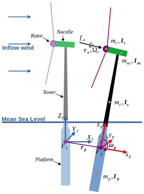 High-fidelity FOWT models account for blade and tower elasticity, drivetrain torsion, platform deformations, and detailed fluid–structure interactions, commonly having model descriptions with upwards of twenty DOFs. While important for structural and fatigue analysis, that level of complexity is unfeasible for analytical control development. Moreover, deformations exert limited influence on the relevant rigid-body platform motions. While many models reduce the complexity of FOWT dynamics [43,44], this work adopts a reduced-order modeling strategy based on [45], which makes rigid-body assumptions for the primary FOWT components, omits higher-order elastic and drivetrain dynamics, and uses a Lagrangian approach to produce a seven-DOF representation that is better suited for Lyapunov-based control development. This subsection describes the simplified rotor and platform dynamics that incorporate the reduced-order model.