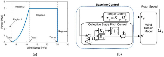 where is the generator speed tracking error. and are the scheduled proportional and integral gains, respectively. The gain scheduling is necessary due to the nonlinear relation between blade pitch angle () and power (P) across wind speeds. Smaller adjustments in blade pitch are needed at higher blade pitch angles to achieve similar control performance [41]. The complete control scheme for wind turbines described above is summarized in Table 1 and the standard control block diagram is shown in Figure 5b.