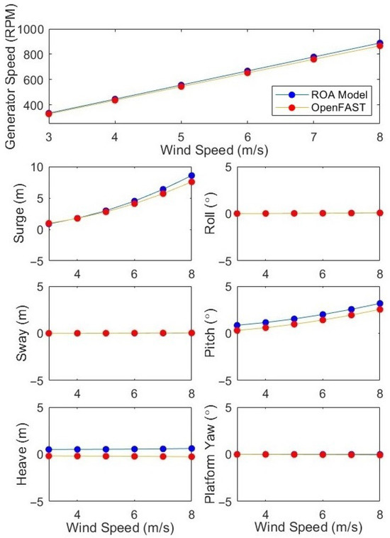 OpenFAST [39] is a widely used open-source simulation tool developed by the National Renewable Energy Laboratory (NREL) to simulate fully coupled aero-hydro-servo-elastic responses of wind turbines, including floating offshore systems. It integrates blade aerodynamics, structural dynamics, wave and current hydrodynamics, mooring mechanics, and control system modules into a unified modular framework. To evaluate the ROA model’s performance in emulating FOWT behavior, we conducted 700-s simulations under steady, below-rated wind conditions with still water using the baseline wind turbine control (Section 2.2), which was implemented in Matlab/Simulink [53,54], for both the ROA model and the higher-fidelity OpenFAST. Figure 6 shows the generator speed and platform displacements time-averaged over the final 600 s of each run after discarding the first 100 s of OpenFAST transients. Overall, the ROA model successfully captures the key trends in generator speed and platform motion. Modest offsets in mean pitch and heave reflect the ROA model’s simplified representation of aerodynamic, mooring, and hydrodynamic loads compared to OpenFAST’s detailed physics. The ROA model also ignores the effects of rotor shaft tilt and coning angles, which impact the FOWT’s surge, pitch, and generator speed behavior. On the same platform, the ROA model runtime measured at roughly 230 s versus about 440 s per simulation for the equivalent OpenFAST run. This significant reduction in computational costs, together with the ROA’s closed-form system and control-law expressions, makes it possible to conduct rapid early-stage parameter sweeps and directly synthesize Lyapunov-based controllers without resorting to a detailed design process.
