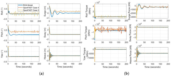 Comparison of ROA model and select OpenFAST cases for platform control at 8 m/s steady wind with non-zero initial conditions (3 m translations, rotations). (a) Platform DOFs; (b) Unconstrained control torques (left) and forces (right).