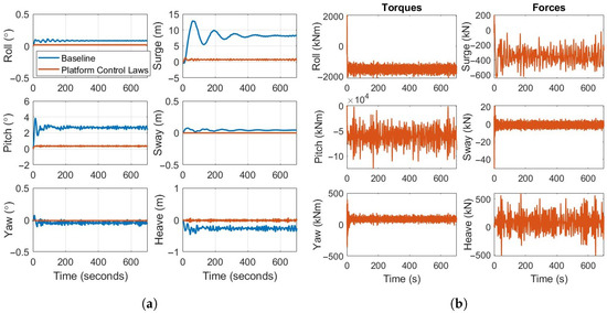 OpenFAST comparison of baseline and platform control at 8 m/s steady wind with irregular waves. (a) FOWT platform motion response for baseline and platform control; (b) Unconstrained platform control torques (left) and forces (right) for the platform control.