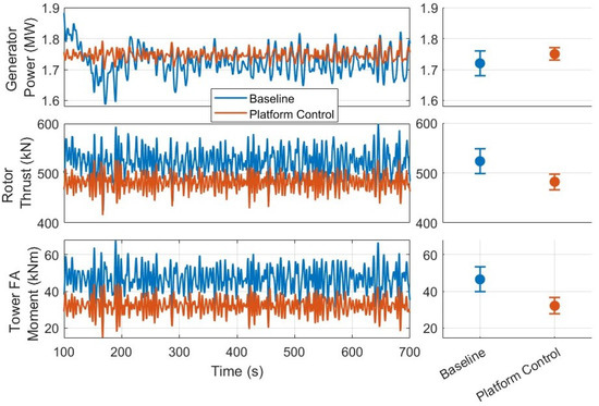 In Figure 8, platform control (where controllers from both Section 2.2 and Section 2.3 are used, see Figure 3) is compared against a baseline (Section 2.2 only, with no platform control) in OpenFAST under 8 m/s steady wind and irregular waves, with zero initial conditions. Figure 8a shows that the OC3-Hywind semisubmersible platform experiences substantial motion in operation. Especially, in the surge and pitch DOFs, aerodynamic loading in below-rated winds induces steady-state deflections of roughly 8 m and 2.5°, respectively, with the baseline controller. These amplitudes can be even worse near rated operation and under combined wind–wave loading. For example, ref. [55] demonstrated that surge displacement at rated wind speeds exceeds 20 m and platform pitch surpasses 5° for the OC3-Hywind platform with the NREL-5MW wind turbine. Assuming ideal actuators, augmenting the proposed platform control law dramatically reduces steady-state motions across all six platform DOFs. The corresponding force and torque demands in Figure 8b reveal that pitch and surge require the largest sustained inputs to counteract aerodynamic rotor thrust. It is noted that most DOFs initially have a high actuation demand for a short duration, which then reduces at the steady state. While controlling for such large FOWT displacements ultimately hinges on novel actuator designs and their optimal placement, recent studies highlight several promising strategies. Catenary mooring line–length control, for example, can shift the mean platform surge by as much as 12.5 m by retracting 15 m of a single mooring line at rated wind conditions [35]. Active water-ballast systems offer another avenue. Ref. [16] studied vertical wake deflection for a semi-submersible FOWT platform. By differentially pumping roughly 500 m3 of water between the columns of the semi-submersible, a pitch of 20° could be attained within 300 s. Rotor yaw for repositioning of FOWTs with extended mooring lines has also been studied for semi-submersible platforms. At 8 m/s wind, a 6° yaw misalignment yields steady-state sway of around 80 m for 970 m long mooring lines in under 1000 s [14]. Actuator saturation and bandwidth limits impacting this initial transient response will be considered in future research. Figure 9 presents the time histories (where the first 100 s of startup transients have been omitted) alongside mean and standard-deviation statistics for power, rotor thrust (including gravitational loading), and tower-base fore–aft bending moment for the simulation case in Figure 8. With platform control engaged, mean power rose by 1.3% while its variability dropped by 64.6%, mean rotor thrust reduced by 7.8% with a 37.6% reduction in standard deviation, leading to a mean tower-base bending load decrease of 30.9% alongside a 34.9% reduction in standard deviation.