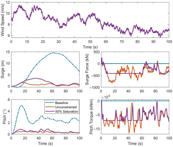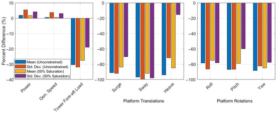 Figure 10 illustrates the first 100 s of the platform surge and pitch response, together with the corresponding surge force and pitch moment commands, from a 700-s turbulent 8 m/s wind simulation with irregular waves. The baseline (with no platform control) is shown in blue dash-dotted curves, and the unconstrained platform control is shown in red curves. For a preliminary test of actuator constraints, actuation along each platform DOF is saturated at 50% of their peak demand from the unconstrained simulation (shown in purple curves). For the baseline, surge motion under aerodynamic thrust grows steadily to over 14 m and the platform pitch almost reaches 5°. Under unconstrained control, platform surge and pitch are significantly attenuated, with their peaks reduced by over 85%. The control performance degrades when a 50% saturation is applied to the actuators. However, the control laws still achieve more than 65% reduction in peak surge and pitch motion compared to the baseline. Figure 11 quantifies the percent changes relative to the baseline, in steady-state mean and standard deviation of the power output, generator speed, tower fore–aft loading, and all six platform DOFs for both platform control scenarios (unconstrained and with 50% saturation). The unconstrained platform control produces a modest increase in mean power of approximately 1.88% but a slight rise in its variability of 5.5%, while reducing tower fore–aft load by roughly 30% in mean and 32% in variability. With a 50% actuator saturation, the mean power gain reduces slightly to 1.74%, but the tower-load reductions reduce to roughly 27% in mean and 19% in variability. All three translational DOFs exhibit greater than 90% reductions in the mean and over 70% in standard deviation under unconstrained control. Even with the 50% saturation, average platform displacements are attenuated by over 80% and variability by over 70% (except for heave, where the reduction in standard deviation drops to 15%). The rotational DOFs are similarly suppressed: unconstrained control yields mean and variability reductions exceeding 75% and 80%, respectively, and the 50% saturated control continues to achieve mean reductions in the 70–85% range. These preliminary results demonstrate that the Lyapunov-based control laws retain substantial performance even with significantly limited actuator authority, highlighting their robustness to practical saturation constraints.