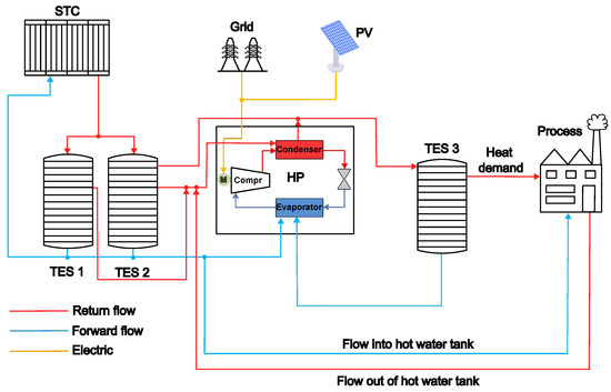 The energy system analyzed in this study represents a comprehensive integration of renewable energy sources and thermal energy storage (TES) technologies designed to decarbonize the facility’s energy supply. Central to this configuration is a solar thermal collector (STC), which charges two stratified TES units. These TES units are hydraulically linked to the STC, whereby low-temperature water from the lower layers of the TESs is supplied to the STC inlet. After solar heating, the water is returned to the upper layers of the TESs, maintaining thermal stratification and TES efficiency.