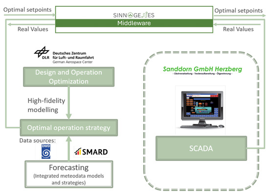 In this study, we applied the BO–IPOPT to a real-world industrial energy system at a food and cosmetics facility consisting of a solar thermal, photovoltaics, heat pump, and three stratified thermal storages. To support the system’s operational planning, which depends on accurate solar forecasts, we also conducted a comparative analysis of several data-driven forecasting techniques at two German locations, employing a recursive multi-step-ahead approach. This comparison aimed to identify forecasting models that not only achieve high prediction accuracy but also maintain low computational overhead, which is essential for their integration into real-time optimization routines in practical applications.