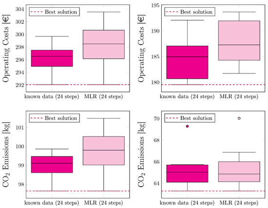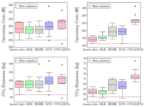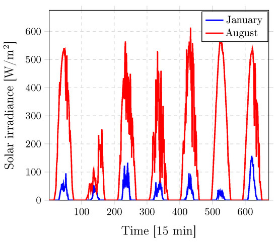 The underlying optimization problem requires input data including solar irradiance for the PV and STC systems, the electricity price, the CO2 emission factor, and the heat demand. The electricity price and emission factor were constant in this study and known in advance for the upcoming hours. Similarly, the required temperature and mass flow for the thermal energy supply process were also specified within fixed bounds and known in advance. Consequently, the only input that had to be forecast as part of the energy management process was the solar irradiance.