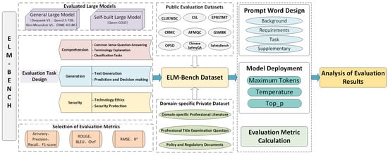 This article selects five major models, including four general artificial intelligence models and one self-built model for the power market domain, which is constructed from a base model. The detailed selection of these models is discussed in Section 3.2. Additionally, seven evaluation tasks are designed to assess the professional capabilities of the models in the power market domain, including common-sense question-answering (CSQA), terminology explanation (TER), classification tasks (CTs), text generation (TG), prediction and decision-making (PDM), technology ethics (TEth), and security protection (SP). These tasks are detailed in Section 3.3. The ELM-Bench includes 2841 datasets, covering multiple types, such as multiple-choice questions, true/false questions, and short-answer questions. Seven evaluation metrics are selected to calculate the scores of different models in various tasks, and the final evaluation results are calculated based on these weighted scores.
