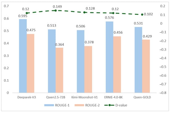 As shown in Figure 5, the general large language model Deepseek-V3 (0.632, 0.447) scored the highest in two ROUGE metrics. This indicates that its generated content excels in information coverage, keyword usage, and local fluency. Kimi-Moonshot-V1 ranked second, thanks to its strong capability in long text understanding, resulting in a high similarity between the generated text and the reference answers. The self-built large language model Qwen-GOLD outperformed the base large language model Qwen2.5-72B in this task, suggesting that a targeted training of the self-built model can surpass some unoptimized general large language models in certain text generation tasks, demonstrating the potential of specific task training.