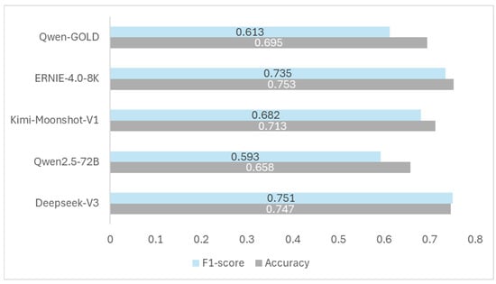 As shown in Figure 4, the general LLMs Deepseek-V3 (0.751) and ERNIE-4.0-8K (0.735) continue to hold the top two positions. Notably, Deepseek-V3 excelled in F1-score, demonstrating its strong capability in distinguishing fine-grained domain knowledge. The self-built large language model Qwen-GOLD had a higher accuracy rate in classification tasks compared to the base large language model Qwen2.5-72B, but its F1-score was lower than that of the top three general models. This suggests potential shortcomings in handling certain categories or balancing precision and recall, highlighting the importance of the robustness of the base model for fine-tuning large language models.