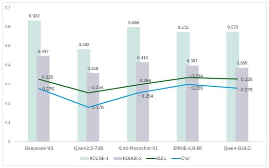 We found that the general large language model ERNIE-4.0-8K (0.334, 0.299) achieved the highest scores in both BLEU and ChrF metrics. Its translations were the closest to the reference texts, with the highest word matching and character-level similarity. The self-built large language model Qwen-GOLD followed closely behind, indicating that models trained or fine-tuned for specific tasks (including translation data from specific domains or pairs) can demonstrate capabilities that rival or even surpass those of top general models.